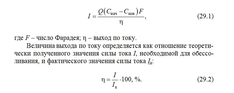 3) наполнение ионообменной смолой рассольных камер. Это уменьшает обратную диффузию ионов, улучшает солесъем, улучшает отвод ионов с поверхности мембран. Сила тока определяется из выражения