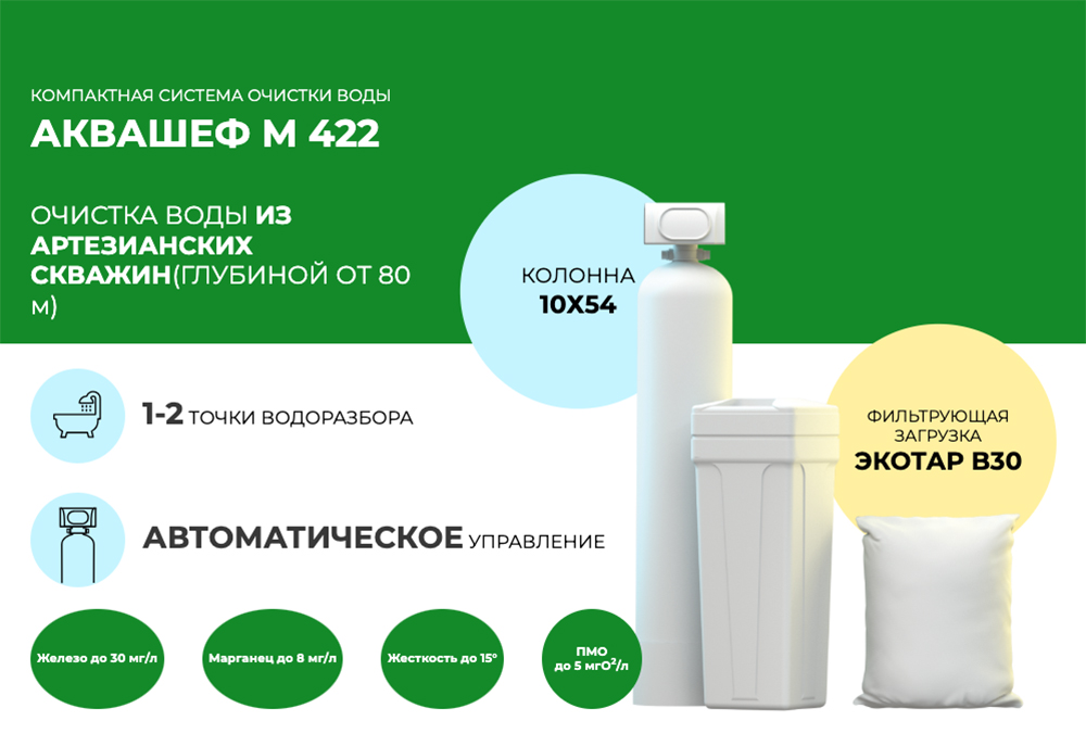 Комплект Гейзер АкваШеф M422 применяется в бытовом и производственном водоснабжении. Комплект представляет собой фильтр комплексной очистки от железа, марганца, солей жесткости, природной органики.