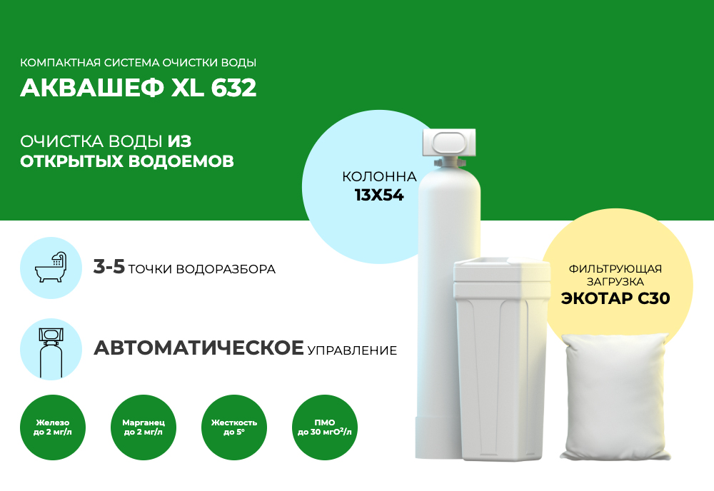 Комплект Гейзер АкваШеф XL632 применяется в бытовом и производственном водоснабжении. Комплект представляет собой фильтр комплексной очистки от железа, марганца, солей жесткости, природной органики.