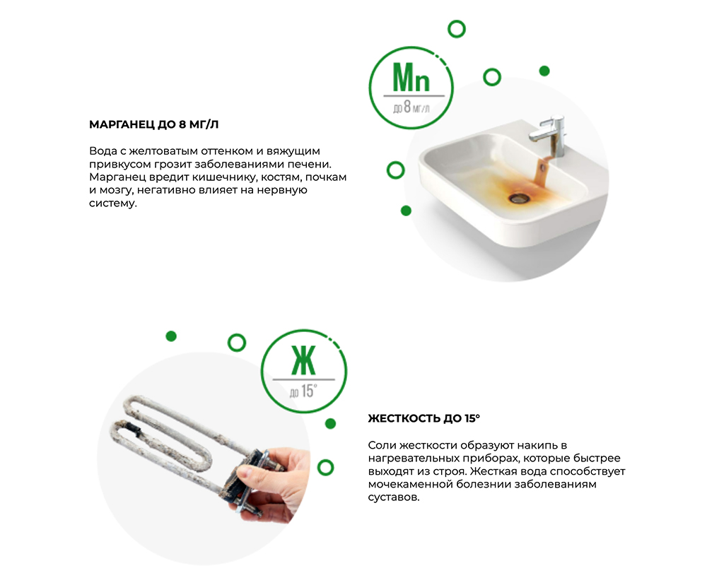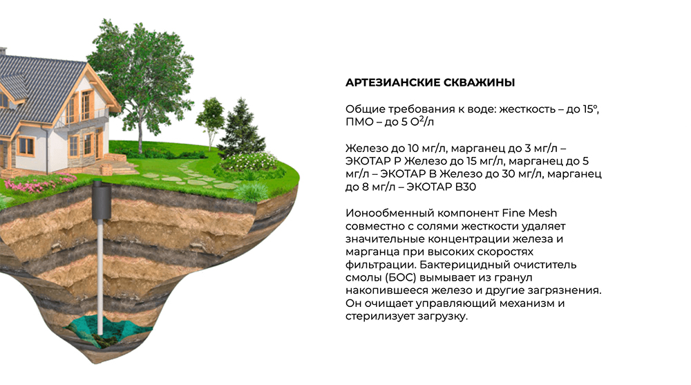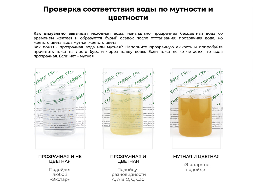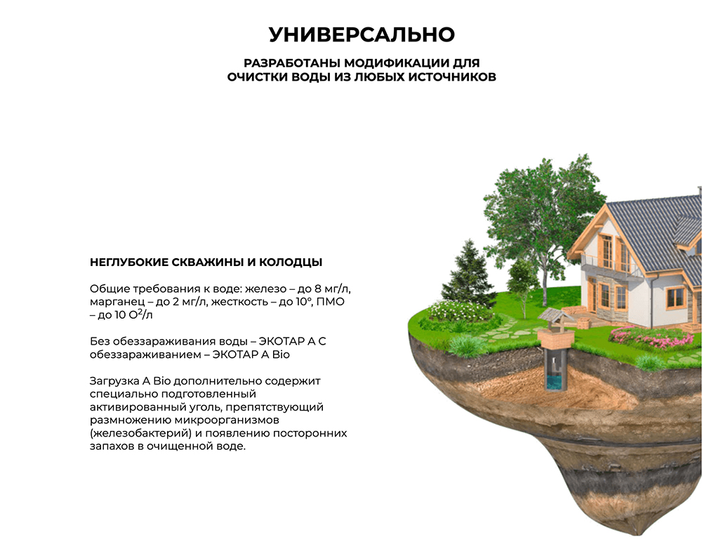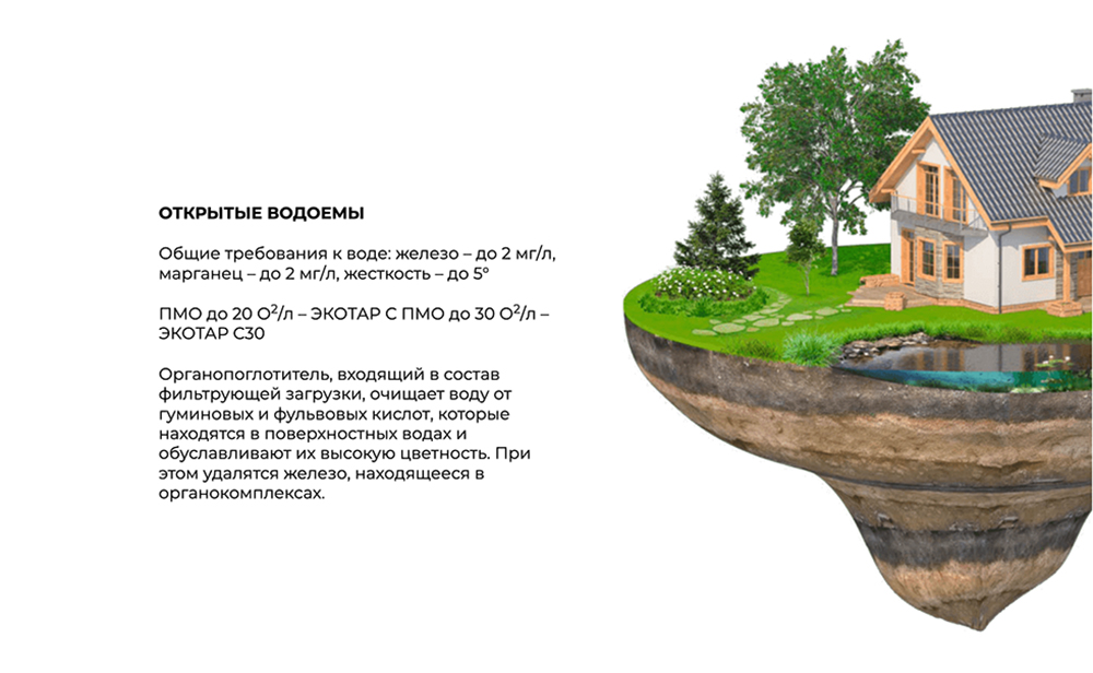 В состав комплекта входит универсальная ионообменная фильтрующая загрузка Экотар C30. Рекомендуется для очистки воды из неглубоких скважин, колодцев и открытых водоемов с высоким содержанием природных органических веществ (до 30 мг/л), органического железа и марганца. Визуальная оценка исходной воды: имеет окраску от желтой до коричневой, не образуется осадок.